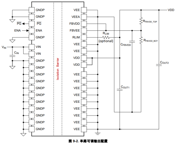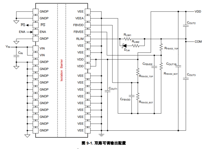 可調(diào)節(jié)的 (VDD – VEE) 輸出電壓(通過外部電阻器):在整個溫度范圍內(nèi)為 15V 至 25V,調(diào)節(jié)精度為 ±1.3%