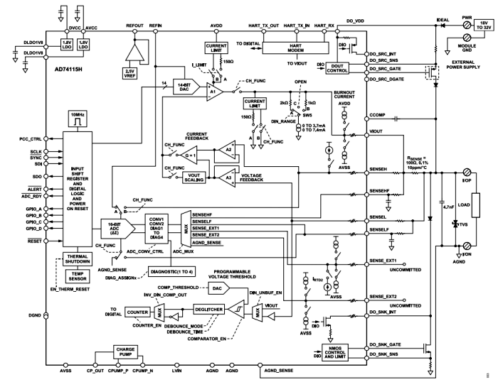 通過(guò)ADP1034配套產(chǎn)品提供電源和隔離。ADP1034和AD74115H一起使用時(shí),正模擬電源AVDD上具備可編程功率控制(PPC),實(shí)現(xiàn)最終應(yīng)用中的優(yōu)化功率解決方案。如果需要單極功能,可以啟用一個(gè)片上充電泵。
