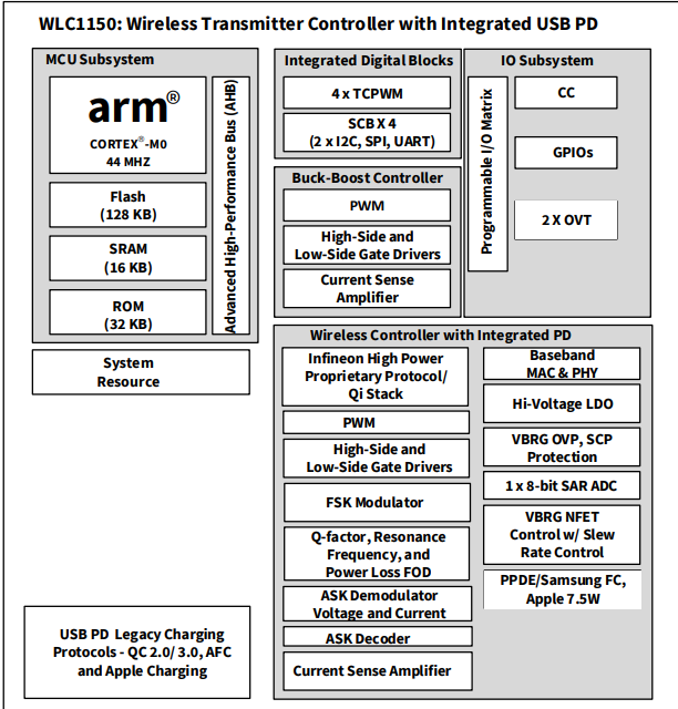 WLC1150提供與各種類型的輸入配置的兼容性,以解決大范圍的高功率應用程序。WLC1150支持輸入電源由USB PD/PPS或直流固定輸入提供的系統電源。IC支持這些輸入配置,而不需要前端DC-DC轉換器有助于實現顯著的系統效率增益,這是高功率的一個重要性能方面系統WLC1150提供了許多可編程功能,用于創建不同的無線發射機解決方案。