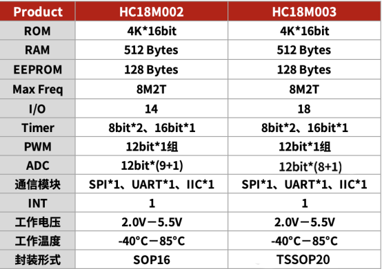 HC18M003是一顆采用高速低功耗CMOS工藝設計開發的增強型8位ADC單片機,內部有4K*16bit MTP程序儲存器,512*8bit RAM,128Bytes EEPROM,最多18個雙向I/O口,3個定時器/計數器,1組12位帶死區控制互補PWM,8+1路12位ADC,1個UART,1個SPI,1個IIC,HC18M003支持2.0~5.5V的工作電壓以及-40℃~+85℃的工作溫度,并且支持引腳映射功能。