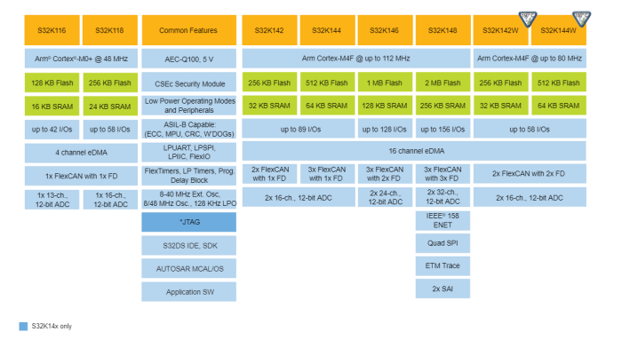 S32K1 MCU具備超低功耗工作模式,具有恩智浦固件的加密安全引擎以及具有低級驅動程序和FreeRTOS?操作系統的汽車級軟件開發套件。S32K1 MCU采用QFN、LQFP和MAPBGA封裝。