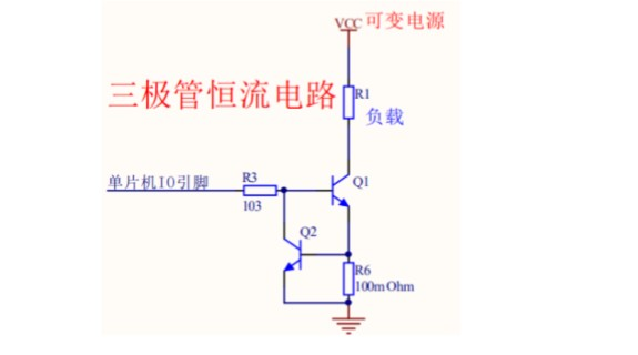 三極管的恒流電路,主要是利用Q2三極管的基極導通電壓為0.6 ~ 0.7V的特性來實現的。當三極管Q2導通時,三極管Q1的基極電壓被拉低,導致三極管Q1截止,因此負載R1不能工作。當Q2三極管導通時,Q1三極管截止,因此負載R1沒有工作。負載R1流過的電流等于R6電阻的電流,而R6電阻的電流等于R6電阻兩端的0.6~0.7V電壓除以R6電阻阻值(固定不變)。因此,即使R1負載的電源端VCC電壓是可變的,流過R1負載的電流也能保持恒定不變,達到恒流的電路效果。