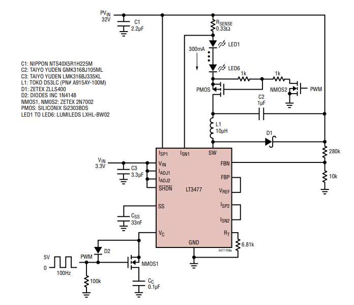 10V至2個白色LED:帶PWM調光的降壓-升壓模式