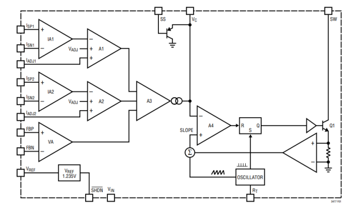 LT3477 是一款具有雙通道軌至軌電流檢測放大器和一個內部 3A、42V 開關的電流模式、3A DC/DC 升壓型轉換器。它集成了一個傳統的電壓反饋環路和兩個獨特的電流反饋環路,旨在起一個恒定電流、恒定電壓源的作用。兩個電流檢測電壓均被設定為 100mV,并可采用 IADJ1和 IADJ2引腳進行獨立調節。可在典型應用中實現高達 93% 的效率。LT3477 具有一種可編程軟起動功能,用于限制啟動期間的電感器電流。誤差放大器的兩個輸入均可從外部獲得,從而提供了正和負輸出電壓 (升壓、負輸出、SEPIC、反激)。利用一個外部電阻器可將開關頻率設置在 200kHz 至 3.5MHz 的范圍內。