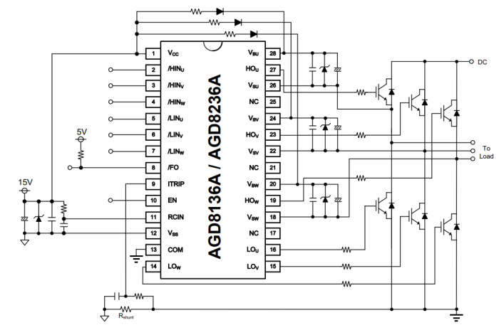 AGD8136A/AGD8236A是600V 6通道柵極驅動器IC,用于控制三相逆變器系統中的IGBT和功率MOS晶體管。由于特殊設計的共模濾波器,它在瞬態電壓變化。