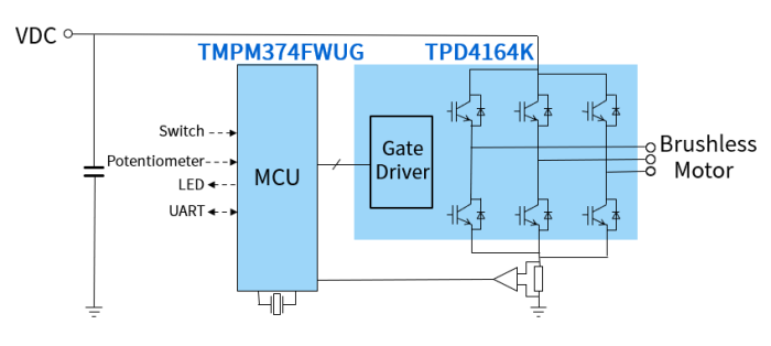 即日起用戶可訪問東芝官網獲取“無感直流無刷電機驅動電路參考設計”,該參考設計使用了新產品TPD4164K,以及帶有矢量控制引擎的TMPM374FWUG微控制器的相關功能。