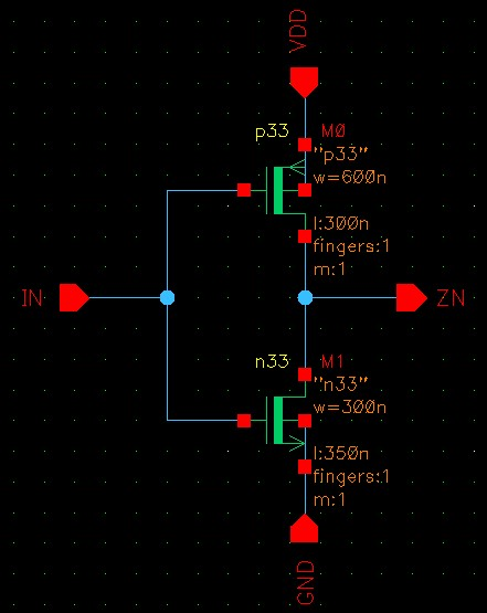 可見,電路由一個NMOS管和一個PMOS連接而成,上面的PMOS管源極連接電源電壓 VDD,下滿的NMOS管源極連接地電壓 GND,然后兩個MOS管的漏極同時連接輸出端口 ZN,兩個MOS管的柵極同時接在輸入端 IN。