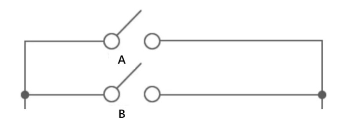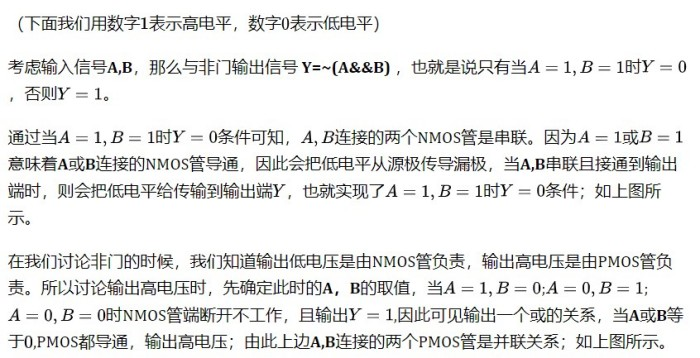 因為NMOS管是柵極高電壓導通,這正好符合這個式子A,B高電平有效,即直接對A,B進行運算,且當式子 (A&&B)=1時,輸出低電平,即正好滿足NMOS管的負責低電平且輸入要求高電平有效,由此只需要實現 A,B兩信號的邏輯與關系就可以了。這個關系邏輯與關系,可以直接通過MOS開關串聯的思路實現。即當A=1時開關A閉合,當B=1時開關B閉合,兩者串聯就是要求A,B同時等于1時這個線路才導通,如下圖所示,且這里NMOS管的導通會把NMOS管源極的低電平導通過來,因此這個正好對應關系式Y=~(A&&B);所以我們只需要串聯兩個NMOS管就可以實現NMOS塊了,如圖(與非門的MOS管實現)所示。