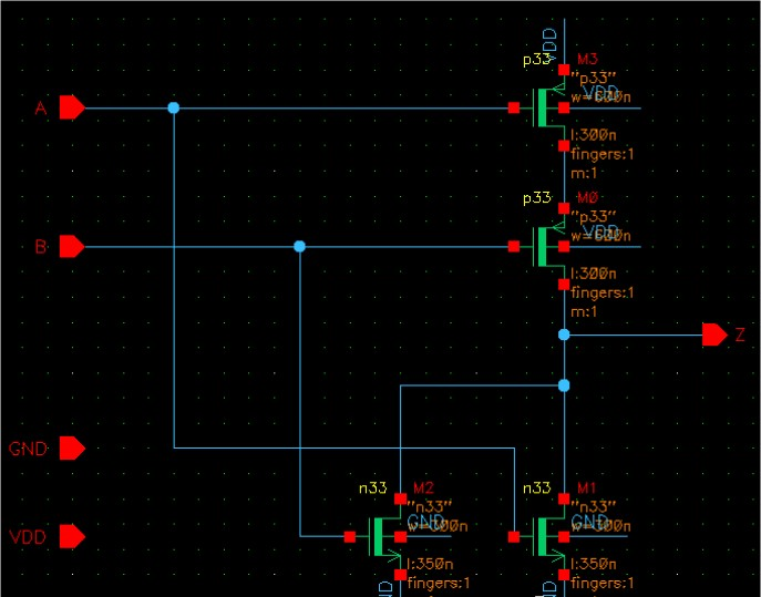 最后把PMOS塊和NMOS塊連接到相同的輸出端口就能實現邏輯運算了。