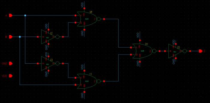 有了基本的或與非邏輯單元,我們就能實現復雜的邏輯功能了。在這里展示一下異或門的實現。有邏輯運算基礎的同志能很快地分析完這個電路,故不做贅述。