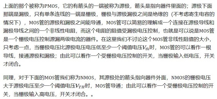 如圖,這個反相器可以理解為是由兩個電壓控制的開關組成。