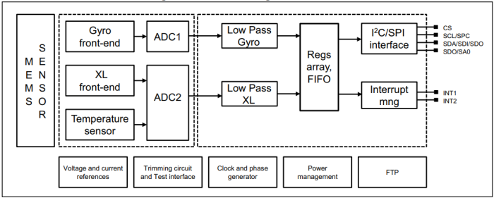 傳感元件是使用ST專有的微機械加工工藝制造的,而IC接口是使用CMOS技術開發的,該技術允許設計專用電路,該電路經過修整以更好地匹配傳感元件的特性。