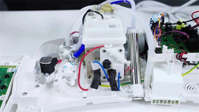 水路方面,進水口管道經過一個電子水閥進入水箱,水箱上安裝有加熱器、溫度傳感器以及水位器,一路用于噴頭沖洗,另一路加熱的水經由調流閥進入沖洗噴頭,再經由噴嘴馬達加壓進行沖洗。