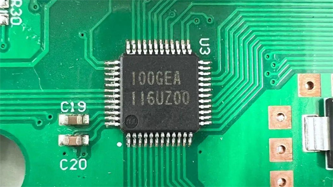 透過有機硅膠可以看到主控芯片上絲印有100GEA的字樣。通過查詢絲印可以查詢到這是1顆瑞薩電子生產的R5F100GEAFB芯片。