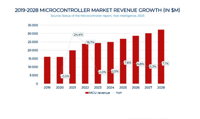 Yole表示,全球MCU出貨量受益于2023年下半年的強(qiáng)勁增長,但上半年的疲軟預(yù)計(jì)將導(dǎo)致下降至265億顆。2022年至2028年的短期MCU市場因全球地緣政治而面臨不確定性,而在自動(dòng)化和連接性的推動(dòng)下,MCU的長期需求依然強(qiáng)勁,預(yù)計(jì)到2028年將增長至超過367億顆。