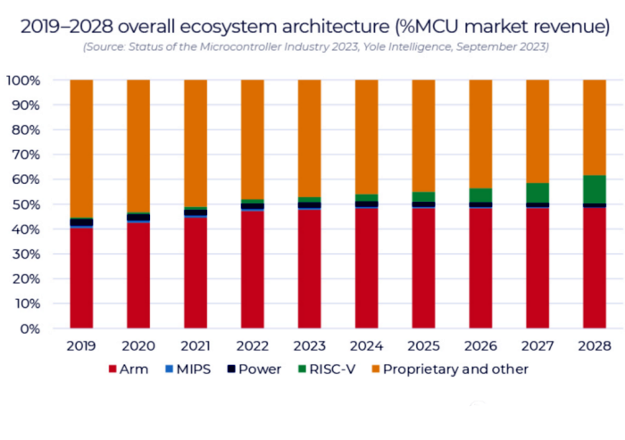 Yole提供的數(shù)據(jù)指出,2023年,MCU平均售價(jià)預(yù)計(jì)將小幅上漲,并全年保持在歷史高位。由于供應(yīng)鏈中斷而轉(zhuǎn)向價(jià)格更高的 MCU 可能會(huì)成為新常態(tài)。4/8/16 位市場份額的下降速度比預(yù)期更快,在 RISC-V架構(gòu)和對高級功能的需求的推動(dòng)下,大部分增長發(fā)生在 32 位領(lǐng)域。到 2028 年,按收入計(jì)算,4/8/16 位市場份額預(yù)計(jì)將降至 33% 以下。