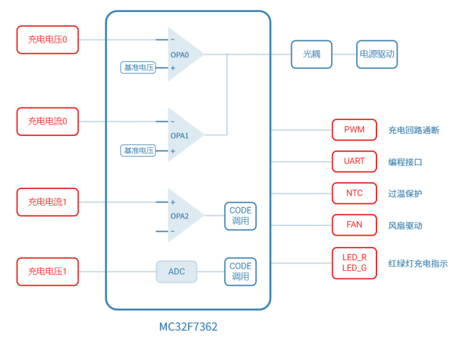與傳統(tǒng)的充電方案相比,MC32F7362內(nèi)置了兩路純模擬OPA,并集成了相應的12位和14位DAC,以實現(xiàn)對恒流和恒壓的控制。此外,芯片還內(nèi)置了一路固定放大倍數(shù)的OPA,用于實現(xiàn)小電流的監(jiān)測與控制。另外,MC32F7362還具備URAT通訊接口,可以在生產(chǎn)和校驗測試環(huán)節(jié)將準確的校驗值存儲于EEprom內(nèi),從而更快更高效地實現(xiàn)批量生產(chǎn)。