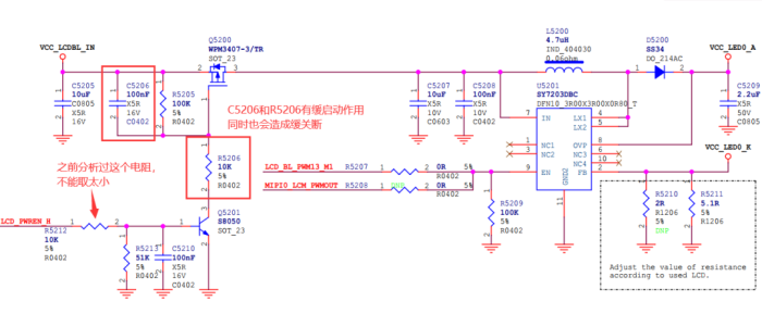 需要注意的是C5206和R5206是起緩啟動(dòng)作用的,但是由于C5206的本質(zhì)是增加了PMOS的Cgs電容,所以在啟動(dòng)緩啟動(dòng)的同時(shí),也會(huì)關(guān)斷緩關(guān)斷。(Cgs充放電時(shí)間都變長(zhǎng))可以電路需求更改電容和電阻從而更改緩啟動(dòng)時(shí)間。
