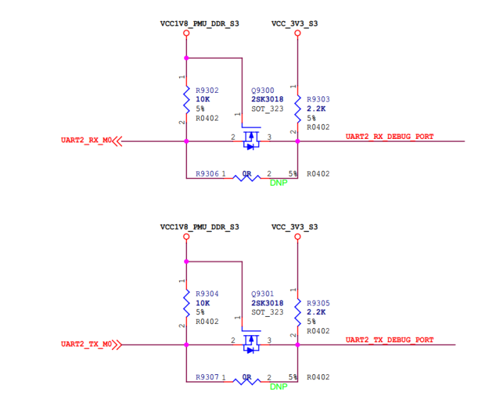 然后在原理圖中也看到了這個(gè)電平轉(zhuǎn)化電路,感覺(jué)器件取值各位可以借鑒一下。