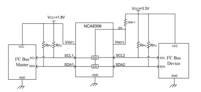 NCA9306-DVSR器件是一款采用使能(EN)輸入的雙路雙向I2C和SMBus電壓電平轉換器,可以在1.2V到5V之間實現雙向電壓轉換而無須使用方向引腳。此開關具有低導通狀態電阻(RON),可以在最短傳播延遲情況下建立連接。當EN為高電平時,轉換器開關打開,并且SCL1和SDA1 I/O被分別連接至SCL2和SDA2 I/O,從而實現端口間的雙向數據流。當EN為低電平時,轉換器開關關閉,在端口之間存在一個高阻抗狀態。除了電壓轉換,NCA9306-DVSR器件還可用于將400kHz總線與100kHz總線隔離開,方法是在快速模式通信過程中控制EN引腳以斷開較慢總線的連接。