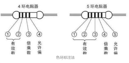 2、色環(huán)標(biāo)注法使用最多,第一道色環(huán)表示阻值的最大一位數(shù)字,第二道色環(huán)表示第二位數(shù)字,第三道色環(huán)表示阻值未應(yīng)該有幾個(gè)零,第四道色環(huán)表示阻值的誤差。