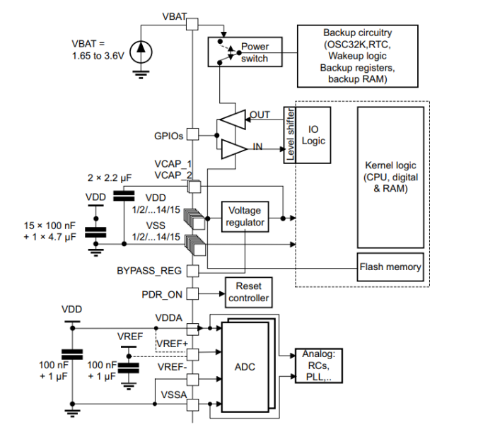 用于RTC的VBAT電源,20×32位備份寄存器+可選的4 KB備份SRAM