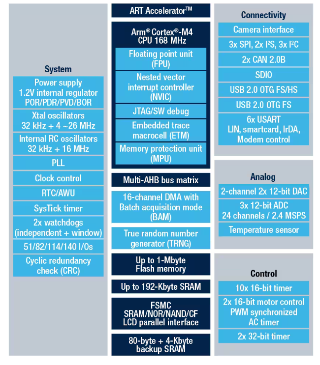 所有設備都提供三個12位ADC、兩個DAC、一個低功耗RTC、十二個通用16位定時器,包括兩個用于電機控制的PWM定時器和兩個通用32位定時器。真實隨機數生成器(RNG)。它們還具有標準和高級通信接口。