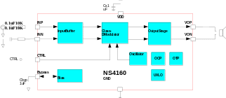 NS4160是單聲道帶AB類,D類工作模式切換功能的音頻功率放大器。芯片內部集成了反饋電阻,放大器的增益可以在外圍通過輸入電阻設置。其原理框圖如下: