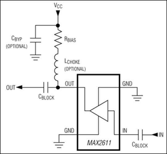 在典型應(yīng)用中,所需的外部元件只有輸入和輸出隔直電容以及一個VCC串聯(lián)電阻。為了提高增益和輸出功率,可以將一個RF扼流圈與偏置電阻上串聯(lián)。