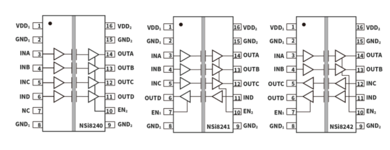 NSI8242W0-DSWR是高可靠性的四通道數字隔離器。此系列產品已通過UL1577安全認證,支持多種絕緣耐壓(3kVrms, 3.75kVrms, 5kVrms, 8kVrms),同時具有低功耗,高電磁抗擾度和低輻射的特性。產品的數據速率高達150Mbps,共模瞬變抗擾度(CMTI)高達200kV/us。在輸入缺失時默認輸出電平配置,且提供數字通道方向配置。 此系列器件的寬電源電壓范圍支持其與大多數數字接口直接連接,易于進行電平轉換。優異的系統級別EMC性能提高了使用的可靠性和穩定性。