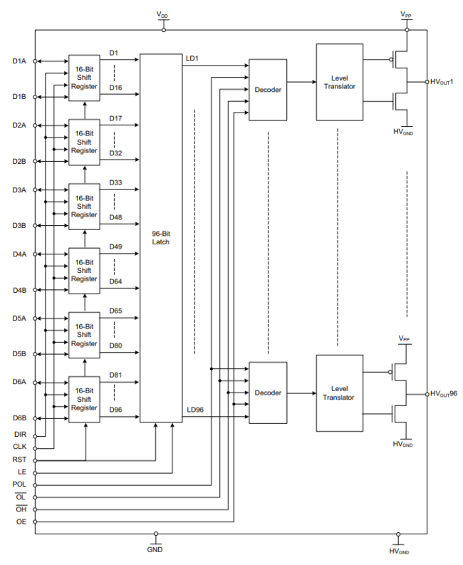 該器件由六個并行的16位移位寄存器、一個96位鎖存器和96個高壓輸出組成。移位寄存器工作在30MHz,由于并行排列,允許180MHz的數據速率。