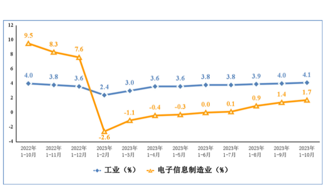 1-10月份,我國規模以上電子信息制造業增加值同比增長1.7%,增速較前三季度提高0.3個百分點;增速分別比同期工業、高技術制造業低2.4個和0.2個百分點。10月份,規模以上電子信息制造業增加值同比增長4.8%,較同期工業高0.2個百分點。