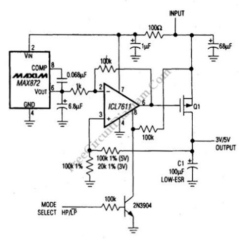 該電路使用ICL7611微功耗運(yùn)算放大器和MAX872電壓基準(zhǔn)。該穩(wěn)壓器可用于替代電荷泵或開關(guān)穩(wěn)壓器。該電路的壓差特性取決于 Q1 的特性。