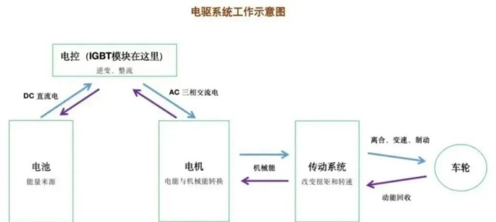 圖:電驅系統示意圖 電驅系統工作:在駕駛新能源汽車時,電機控制器把動力電池放出的直流電(DC)變為交流電(AC)(這個過程即逆變),讓驅動電機工作,電機將電能轉換成機械能,再通過傳動系統(主要是減速器)讓汽車的輪子跑起來。反過來,把車輪的機械能轉換存儲到電池的過程就是動能回收。電驅系統工作示意圖如下: