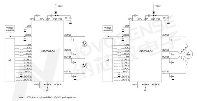 NSD8381-Q1支持配置為4個獨立的半橋驅動,從而可以驅動通用感性阻性負載,DC電機或者LED。更加靈活適配不同負載工況。
