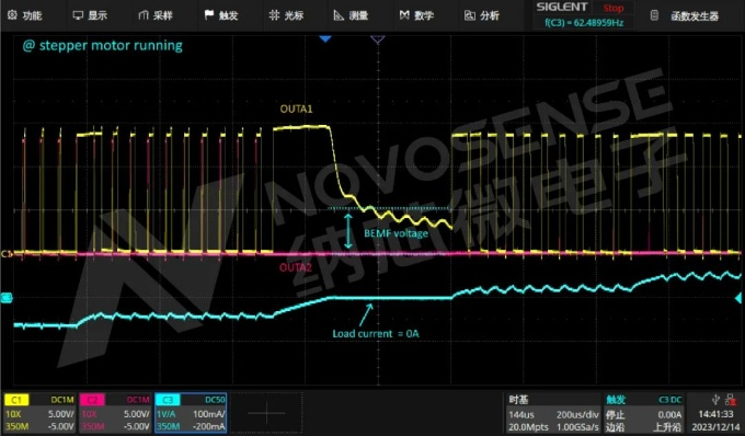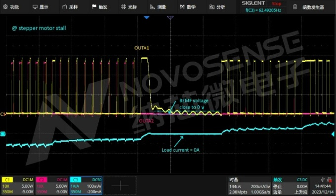 步進電機在運行狀態下,反電勢和相電流存在特定關系,可以反應步進電機的運行狀態。NSD8381-Q1內置點電機的反電勢檢測模塊,會在每個周期的電流過零點,對電機反電勢進行采樣。通過反電勢電壓和內置閾值電壓對比,判斷電機運行狀態。