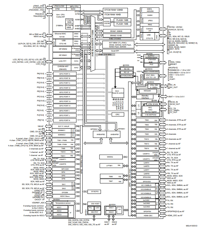 STM32F779IIT6包含高速嵌入式存儲(chǔ)器,閃存容量高達(dá)2M字節(jié)、512 KB SRAM(包括用于關(guān)鍵實(shí)時(shí)數(shù)據(jù)的128 KB數(shù)據(jù)TCM RAM)、16 KB指令TCM RAM(用于關(guān)鍵實(shí)時(shí)例程)、4 KB備份SRAM,以及連接到兩條APB總線、兩條AHB總線、32位多AHB總線矩陣和支持內(nèi)部和外部存儲(chǔ)器訪問的多層AXI互連的大量增強(qiáng)型I/O和外圍設(shè)備。