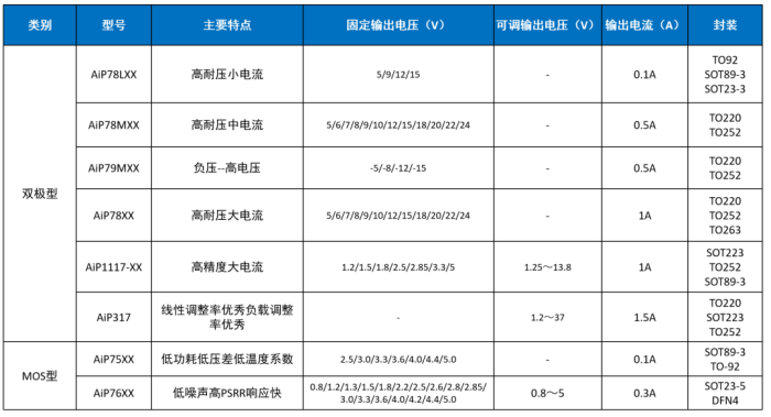 LDO指的是低壓差線性穩(wěn)壓器,是一種輸入電壓大于輸出電壓的直流交流穩(wěn)壓器,可以分為雙極型和MOS型。雙極型LDO可以承受高輸入電壓,靜態(tài)電流為mA級(jí)別,MOS型LDO噪聲更小,靜態(tài)電流相比于雙極型也更低,一般在uA級(jí)別。 中微愛(ài)芯已開(kāi)發(fā)的雙極型LDO有78XX系列、79XX系列、AiP1117系列、AiP71XX系列等,MOS型LDO有AiP75XX系列和AiP76XX系列,涵蓋正電源穩(wěn)壓器、負(fù)電源穩(wěn)壓器,低壓差正電源穩(wěn)壓器、輸出電壓調(diào)整電路、低壓差穩(wěn)壓器、可調(diào)精密并聯(lián)穩(wěn)壓器等多種類(lèi)型。以AiP1117-ADJ為例,這是一款最大輸出電流為1A的低壓差穩(wěn)壓器,內(nèi)置溫度保護(hù),外接電阻即可實(shí)現(xiàn)輸出電壓可調(diào),可廣泛應(yīng)用于各種需要高精度,低壓降正向穩(wěn)壓場(chǎng)合。