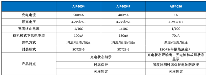 中微愛(ài)芯電池管理產(chǎn)品線涵蓋鋰電池和鋰磷酸鹽電池管理監(jiān)控器、線性鋰電池充電芯片,其中線性鋰電池充電芯片的有多種充電電流可選。以AiP4054為例,這是一款專(zhuān)門(mén)為單節(jié)鋰電池設(shè)計(jì)的線性充電芯片,內(nèi)置完善的保護(hù)電路(電流監(jiān)控、欠壓鎖定、自動(dòng)再充電、過(guò)溫保護(hù)、狀態(tài)指示功能),充電電流可編程,安全性較高。此外,AiP4054采用體積較小的SOT23-5封裝,外圍電路簡(jiǎn)單,非常適用于物流箱藍(lán)牙鎖、TWS耳機(jī)充電倉(cāng)、電子煙等低功耗、小體積、快速充電的場(chǎng)合。 常見(jiàn)的電池管理芯片有AiP4056、AiP4054系列等。
