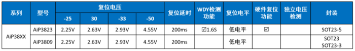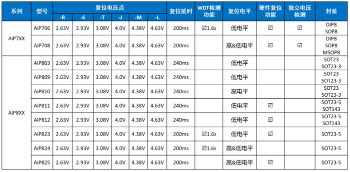 中微愛(ài)芯提供帶看門(mén)狗功能處理器復(fù)位電路、微處理器復(fù)位電路、電壓檢測(cè)電路等多種電源監(jiān)控芯片,擁有齊全的復(fù)位電壓點(diǎn)。以AiP706為例,這是一款帶看門(mén)狗功能的微處理器監(jiān)控電路芯片,內(nèi)置復(fù)位電路和看門(mén)狗定時(shí)器(1.6秒超時(shí))。AiP706微處理器監(jiān)控電路降低了監(jiān)控系統(tǒng)中電源和電池功能所需的復(fù)雜性和組件數(shù)量,非常適用于光伏發(fā)電系統(tǒng)。 常見(jiàn)的復(fù)位芯片有AiP38XX系列,AiP7XX系列和AiP8XX系列,我司設(shè)計(jì)多種封裝可供選擇,應(yīng)用場(chǎng)景廣泛