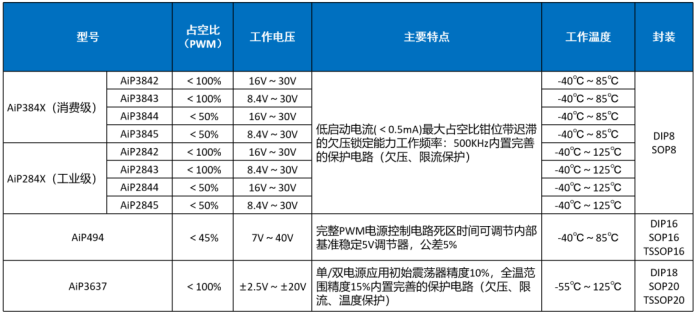 脈寬調(diào)制(PWM)是指脈沖寬度調(diào)制,也可稱(chēng)之為定頻調(diào)寬,即開(kāi)關(guān)頻率保持恒定,而通過(guò)改變?cè)诿恳粋€(gè)周期內(nèi)的驅(qū)動(dòng)信號(hào)的占空比來(lái)達(dá)到調(diào)制的目的。當(dāng)輸出電壓發(fā)生變化時(shí),通過(guò)環(huán)路的控制,便會(huì)使驅(qū)動(dòng)信號(hào)的占空比發(fā)生改變,從而維持輸出電壓的恒定。 中微愛(ài)芯可提供輸出占空比<100%或<50%的電流模式PWM控制器、直流馬達(dá)驅(qū)動(dòng)的PWM控制器。以AiP494為例,這是一款固定頻率脈沖寬度調(diào)制電路,集成PWM控制電路所需的幾乎全部模塊,外圍電路簡(jiǎn)單。提供共發(fā)射極/共集電極輸出,可用于驅(qū)動(dòng)橋式或推挽電路開(kāi)關(guān)管。常見(jiàn)的電源PWM控制器有AiP384X系列、AiP284X系列等,廣泛應(yīng)用于工業(yè)控制、消費(fèi)電子等場(chǎng)合。