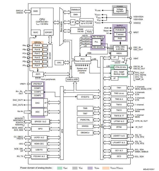 STM32G0B1RCT6包括存儲器保護單元(MPU)、高速嵌入式存儲器(144KB SRAM和512 KB閃存程序存儲器,具有讀保護、寫保護、專有代碼保護和安全區(qū)域)、DMA、廣泛的系統(tǒng)功能、增強的I/O和外圍設(shè)備。
