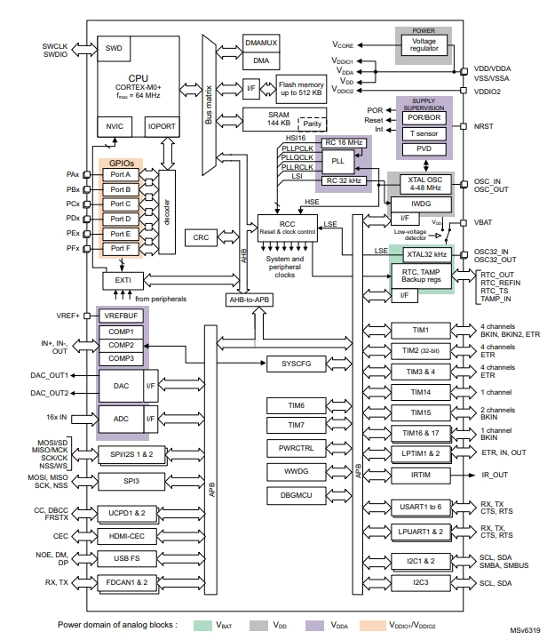 STM32G0B1VET6包括存儲器保護單元(MPU)、高速嵌入式存儲器(144 KB SRAM和512 KB閃存程序存儲器,具有讀保護、寫保護、專有代碼保護和安全區域)、DMA、廣泛的系統功能、增強的I/O和外圍設備。