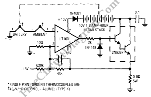 放大器通過電池大大減少電流,放大器以 4300 的增益運行,以保持其輸入平衡。電池以高速率充電,直到發生加熱,然后電路逐漸減少充電。電路中給出的值將電池表面溫度相對環境溫度的升高限制在 5'C 左右。