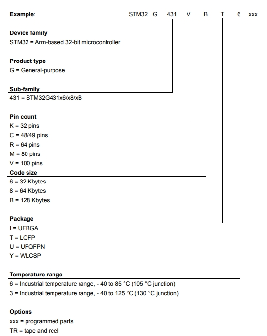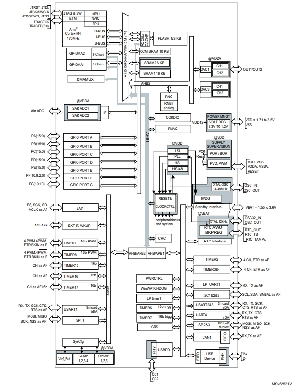 STM32G431KBU3嵌入了高速存儲器(128 KB的閃存和32 KB的SRAM)、廣泛的增強型I/O和連接到兩條APB總線、兩條AHB總線和32位多AHB總線矩陣的外圍設備。STM32G431KBU3還為嵌入式閃存和SRAM嵌入了幾種保護機制:讀出保護、寫入保護、安全存儲區域和專有代碼讀出保護。