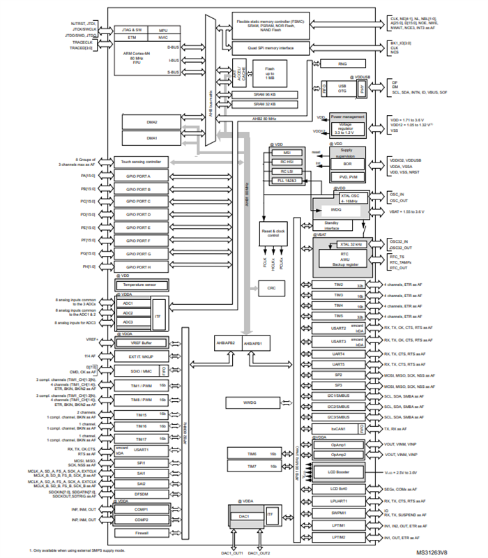 STM32L476VCT6采用嵌入高速存儲(chǔ)器(高達(dá)1Mbyte的閃存,高達(dá)128Kbyte的SRAM),用于靜態(tài)存儲(chǔ)器的靈活外部存儲(chǔ)器控制器(FSMC)(用于100引腳及以上包的設(shè)備),Quad SPI閃存接口(所有包均可用)和廣泛的增強(qiáng)I/o和外設(shè),連接到兩個(gè)APB總線,兩個(gè)AHB總線和一個(gè)32位多AHB總線矩陣。