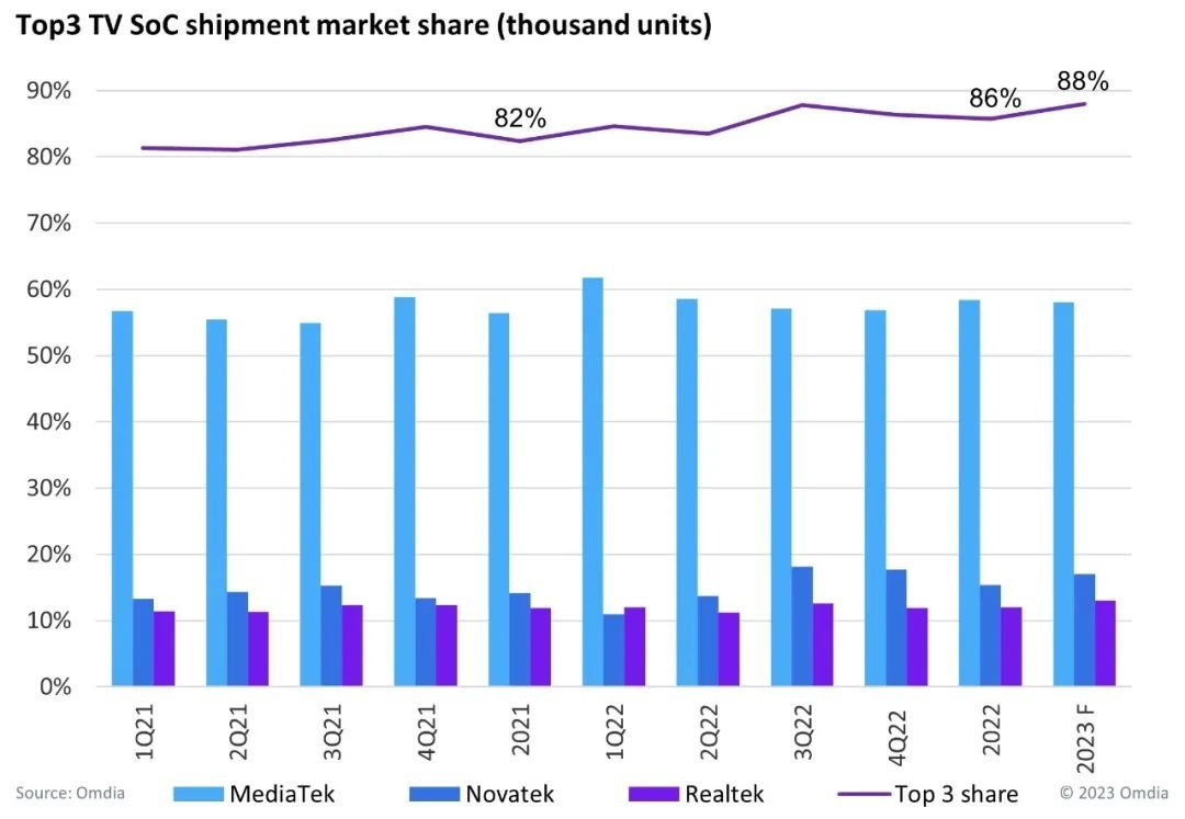 前三大電視芯片供應(yīng)商之市場占有率將更為集中,預(yù)計(jì)2023年將達(dá)88%