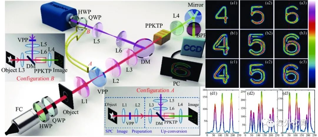 對于基于體塊晶體的頻譜遷移探測應用,為了提升轉換的量子效率,通常有兩種方式:第一種是通過諧振腔的方式增強泵浦光的功率,從而提升量子效率(如圖4(b)所示);第二種是基于高峰值功率的脈沖激光獲得高的量子轉換效率(如圖4(c)所示)。相對于波導結構,體塊晶體可以用于帶空間結構的光場或者圖像的轉換。對于一些結構光場或者圖像的頻譜遷移探測應用,可以選擇體塊晶體作為非線性轉換介質。