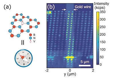 (a)六方氮化硼中的硼空位缺陷??瘴豢沙洚?dāng)用于磁場測量的原子大小的量子傳感器,對磁場敏感,就像一個納米“磁針”。(b)量子傳感器納米陣列的光致發(fā)光可反應(yīng)磁場的變化。