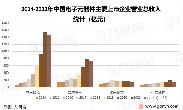 2014-2022年中國電子元器件主要上市企業(yè)營業(yè)總收入統(tǒng)計(jì)(億元)